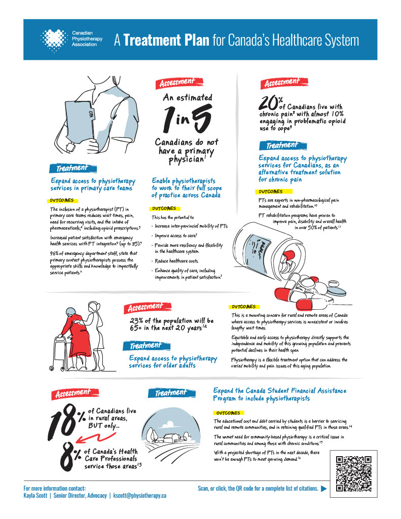 The CPA Pre-Budget Submission is summarized in the infographic below, titled: “Physiotherapy – A Treatment for Canada’s Healthcare System”. Highlighted within are key recommendations to the committee with evidence to support the impact potential of physiotherapy. The infographic, which was created with the input of physiotherapists across Canada, will be a vital tool in fueling ongoing advocacy efforts and in elevating the profile of the profession with the federal government.