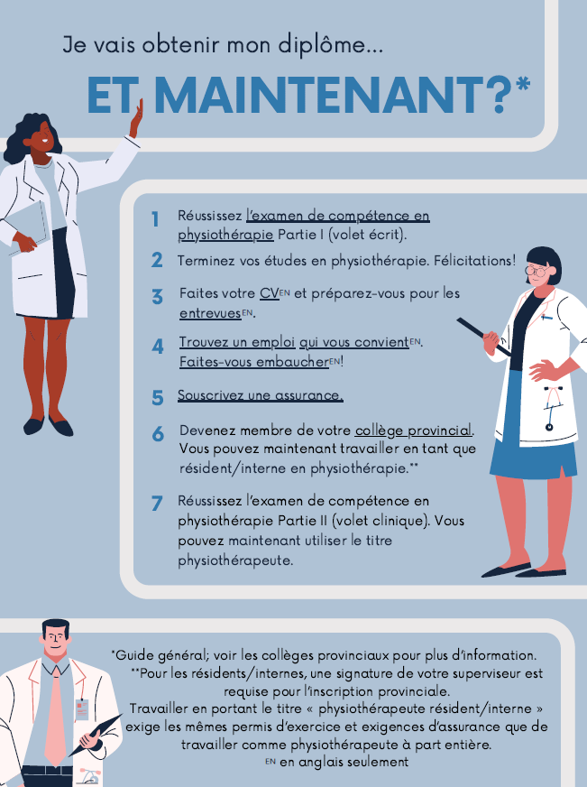 Transitioning from student to professional can be one of the biggest changes in life. The Canadian Physiotherapy Association (CPA) has put together a toolkit of resources that will ease the process. Below Passer du statut d’étudiant à celui de professionnel peut s’avérer un des plus grands défis de votre vie. L’Association canadienne de physiothérapie (ACP) a élaboré une trousse d’outils contenant des ressources qui faciliteront cette transition. Vous trouverez ci-dessous des liens pour en apprendre plus sur les associations nationales, provinciales et territoriales qui plaident en faveur de la profession de physiothérapeute, des conseils pour trouver un emploi et des occasions de perfectionnement professionnel pour prolonger votre apprentissage tout au long de votre carrière.