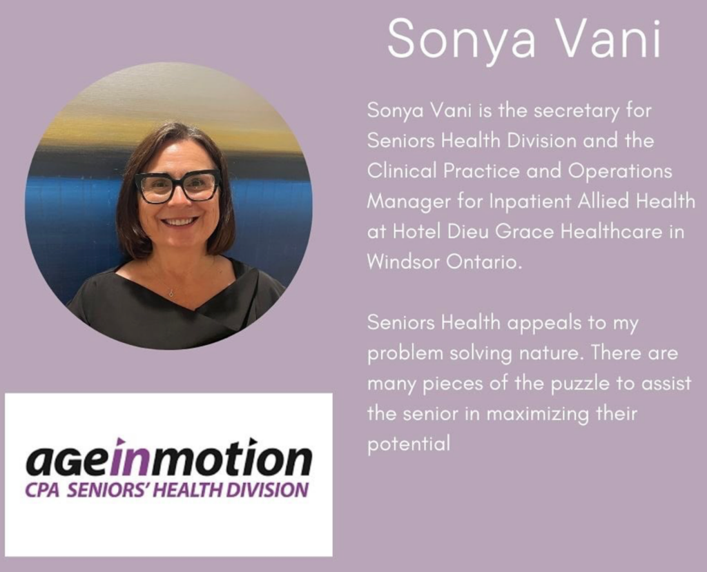 The Seniors’ Health Division (SHD) is the special interest group within the Canadian Physiotherapy Association (CPA) dedicated to physiotherapy practice in rehabilitative care of older adults. SHD is comprised of physiotherapists, physiotherapy students and physiotherapy support personnel from across Canada. Our members practice in a variety of settings, including acute geriatric care, geriatric rehabilitative and restorative units, long-term care settings, community-based and home care settings.